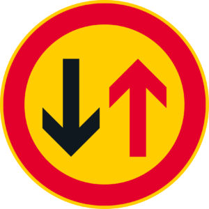 Merkillä osoitetaan, että vastakkaisesta suunnasta tulevalle ajoneuvolle ja raitiovaunulle on tarvittaessa annettava mahdollisuus ensiksi sivuuttaa merkillä osoitettu tienkohta.