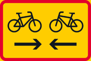 Lisäkilvellä H23.1 osoitetaan risteävä kaksisuuntainen pyörätie. Lisäkilpeä käytetään merkin B5 tai B6 yhteydessä.