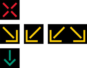 2) Keltainen nuolenmuotoinen vilkkuva valo osoittaa, että valo on vaihtumassa punaiseksi tai ajokaista on edessä suljettu. Tällaisella ajokaistalla oleva ajoneuvo on siirrettävä nuolella osoitettuun suuntaan sellaiselle ajokaistalle, jolla näytetään vihreää valoa. Jos keltaisia nuolen muotoisia vilkkuvia valoja on kaksi, on ajoneuvo siirrettävä jommankumman nuolen suuntaan.