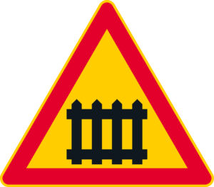 Merkillä varoitetaan rautatien tasoristeyksestä, jossa on puomit.